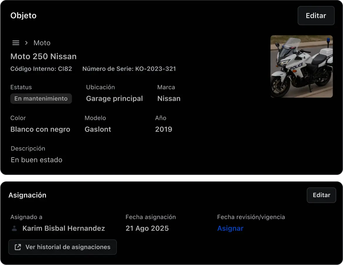 Controla armas, radios, vehículos y uniformes con historial de entradas y salidas. Asignaciones, mantenimiento y alertas por vencimiento.